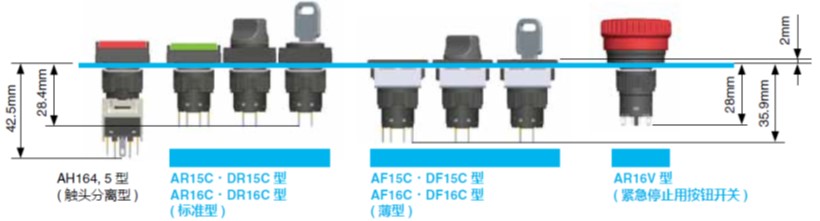 除了标准型,还备有面板伸出长度为2mm的薄型产品。由于能够实现密集安装,因此实现美观大方的面板设计。采用接触可靠性优异的触头结构,镀金触头和快速动作结构,可遵照IC等级(5V 1mA)使用。