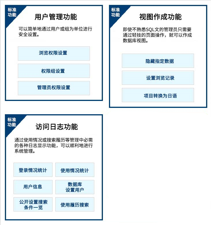 具备以强化安全性为目的,以“访问日志管理功能”和“用户管理功能”为代表的系统管理所必需的各类功能。